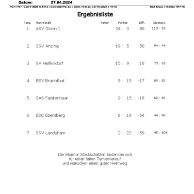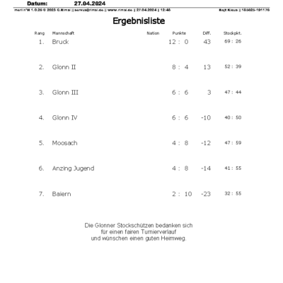 Am Vormittag traten Mannschaften aus Moosach, Bruck und Baiern sowie eine gemischte Mannschaft aus Anzing mit zwei Jugendspielern zu einem packenden Wettstreit an. Die Gruppe wurde durch drei Teams des ASV ergänzt. Die Brucker sicherten sich nach intensiven Spielen den Turniersieg, während die Platzierungen der Heimmannschaften den Erwartungen entsprachen: Glonn II auf dem zweiten Platz, gefolgt von Glonn III und Glonn IV. Letztere überraschten jedoch, indem sie die Spiele gegen ihre lokalen Rivalen gewannen. Moosach belegte den fünften Platz, gefolgt von Anzing auf dem sechsten und Baiern auf dem siebten Platz.