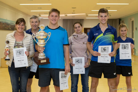 Am Nachmittag ging es dann für die Damen und Herren um einen Platz auf dem Stockerl. Leider mussten einige Spieler kurzfristig verletzungsbedingt absagen, was aber der Qualität der Spiele keinen Abbruch tat. Am Ende stand in der weiblichen Konkurrenz erneut Margit Paul ganz oben auf dem Treppchen, gefolgt von Manuela Ebert und Gabi Mühlthaler. Bei den Herren lag die Favoritenrolle eigentlich bei der neuen Nr. 1 des Herrenteams Manuel Völke, neben Bernhard Friedl einer der beiden Neuzugänge zur neuen Saison. Nachdem der Letztgenannte verletzungsbedingt passen musste, lief bis zum Finale auch alles wie erwartet. Dort traf der Favorit auf Bastian Wagner, der, wie sich im Turnierverlauf zeigte, an diesem Tag jedoch glänzend aufgelegt war. Und so sicherte sich in einem tollen Match schließlich etwas unerwartet der „Underdog“ den Titel. Somit blieb der Siegerpokal in der Familie, denn Bastian beerbte seinen Vater Markus, der im Spiel um den dritten Platz heuer Robert Wäsler gratulieren musste. Während der gesamten Veranstaltung wurden wie immer alle Anwesenden bestens durch das Buffet von Angelika und Franz Kronthaler versorgt.