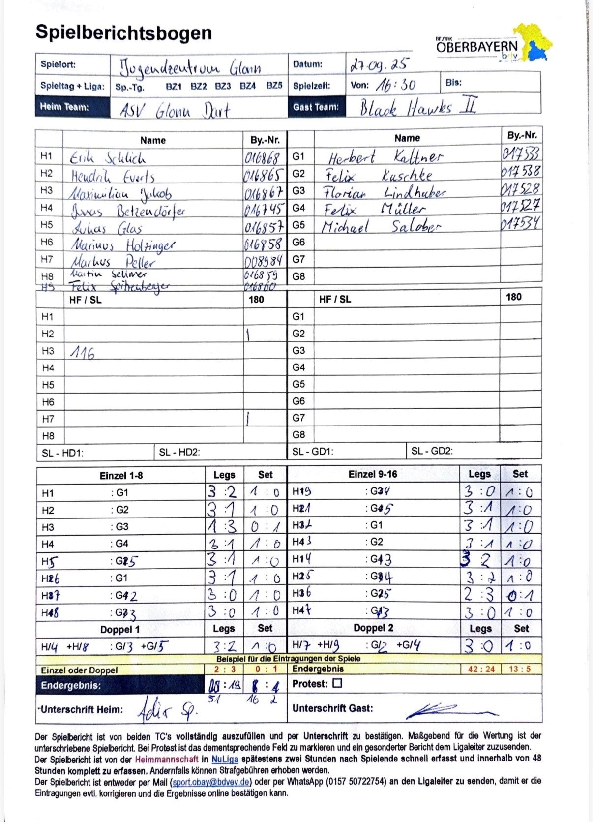Die Abteilung Dart im ASV Glonn hat ihr erstes Ligaspiel in der Vereinsgeschichte bestritten – und das gleich mit großem Erfolg. Gegen die Black Hawks 2 aus Traunreut gab es einen klaren 16:2-Sieg, der die Glonner zum Auftakt direkt an die Tabellenspitze brachte.